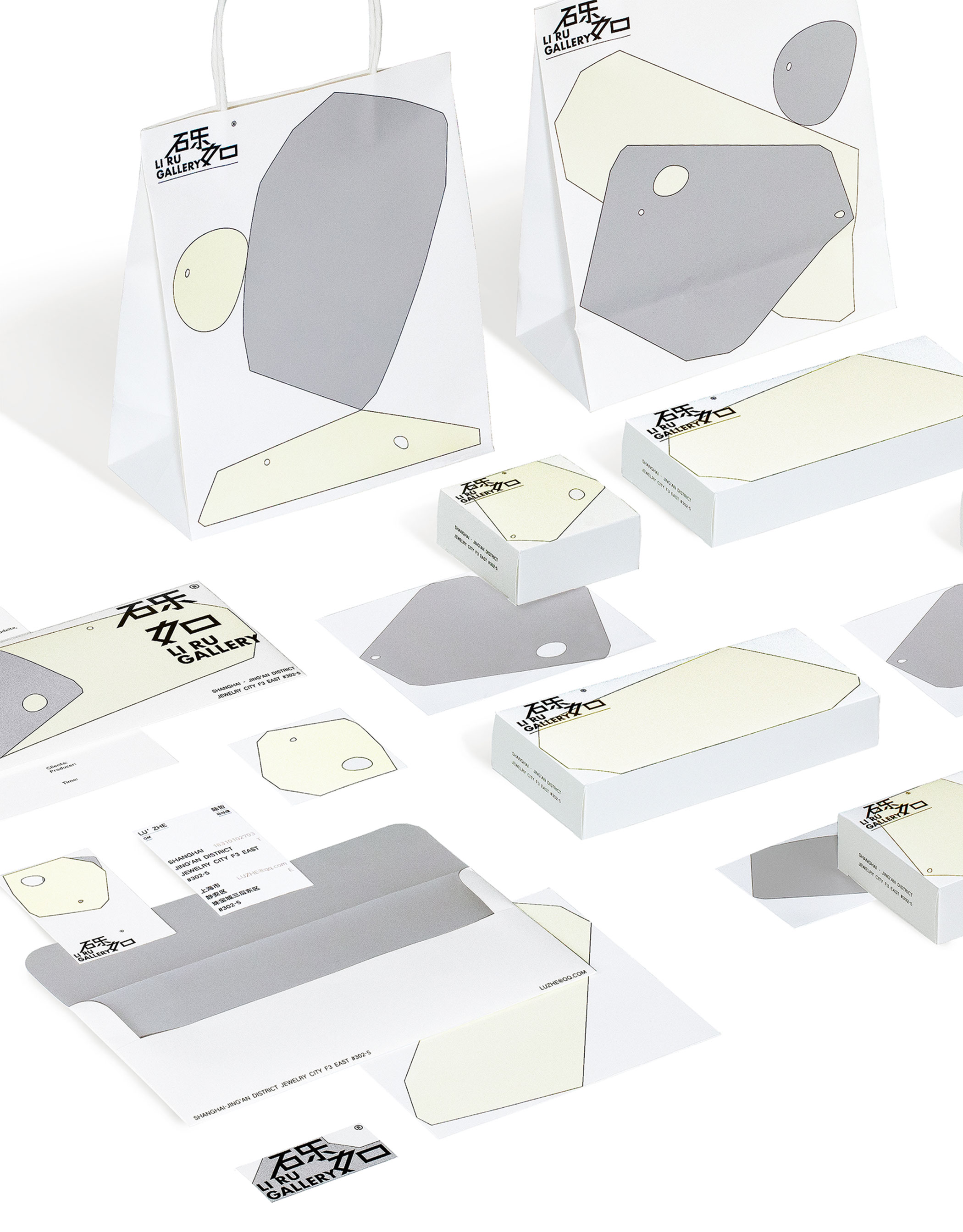 砾如是一家专注收藏级玉石展示与销售的艺廊,视觉形象从石材本身的质感出发,经过线条切割的几何形概括了石材本身粗粝的特质,低饱和度的配色则彰显了玉石温润与谦逊的品格,力图通过简单的视觉语言重现石材本身未经雕琢的美感。