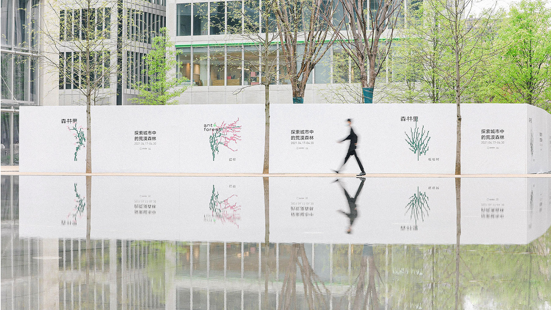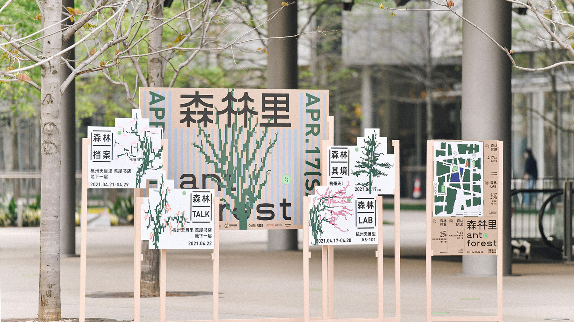 "Ant Forest" is an offline environmental advocacy campaign launched by Ant Forest at Hangzhou’s Tianmuli. In its visual identity, we used the gathering and dispersing of pixel dots as the core element—symbolizing how individual efforts can drive away the desert and form a lush green landscape, echoing Ant Forest’s call for a low-carbon lifestyle for all. Inspired by the various plants from Ant Forest, the design extends into different growth scenarios, achieving both visual richness and a scientifically grounded sense of authenticity.