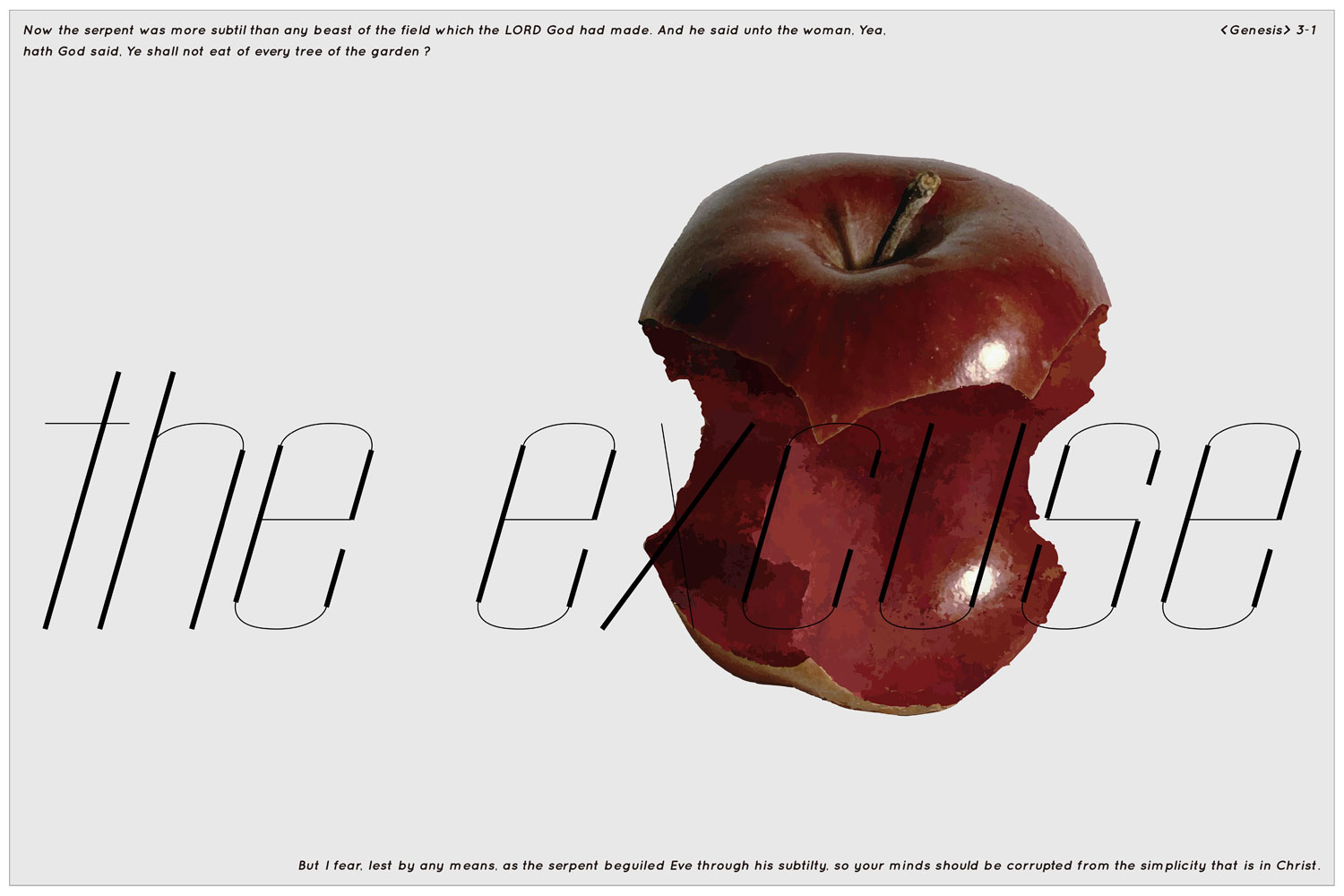 一个咬开之后还是外皮的苹果,隐喻着被逐出伊甸园的亚当和夏娃或许并不是因为偷食了禁果,上帝需要的仅仅是一个借口,欲加之罪,何患无辞。