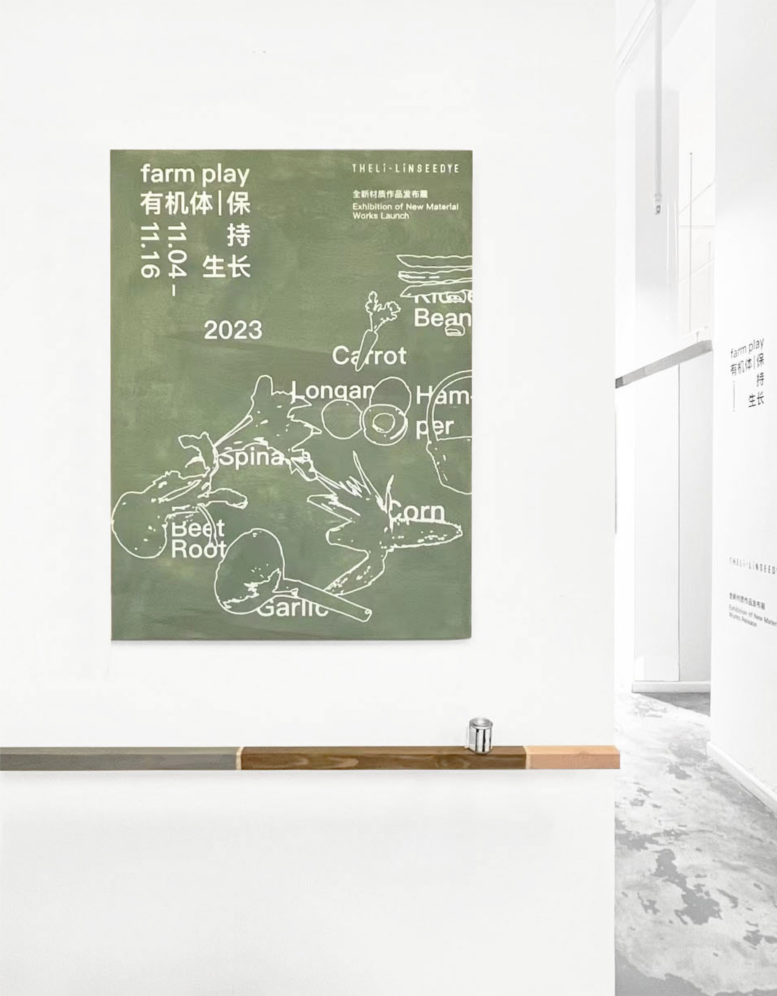 Farm play is the launch exhibition of THELí’s new natural wood dye material, LíNSEEDYE, presented at YAN BOOKS in Beijing. In the visual design, we overlaid the outer contours of fruits and vegetables with natural wood grains, allowing the undulating colors to evoke an environment immersed in growth.