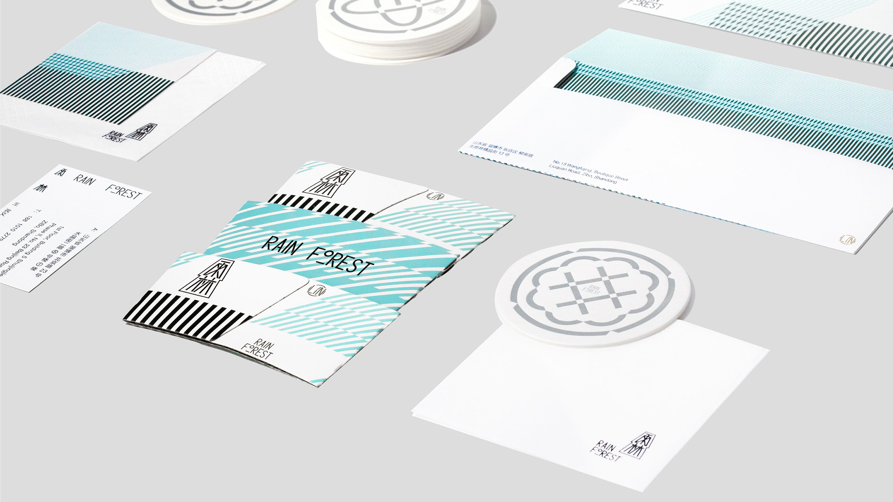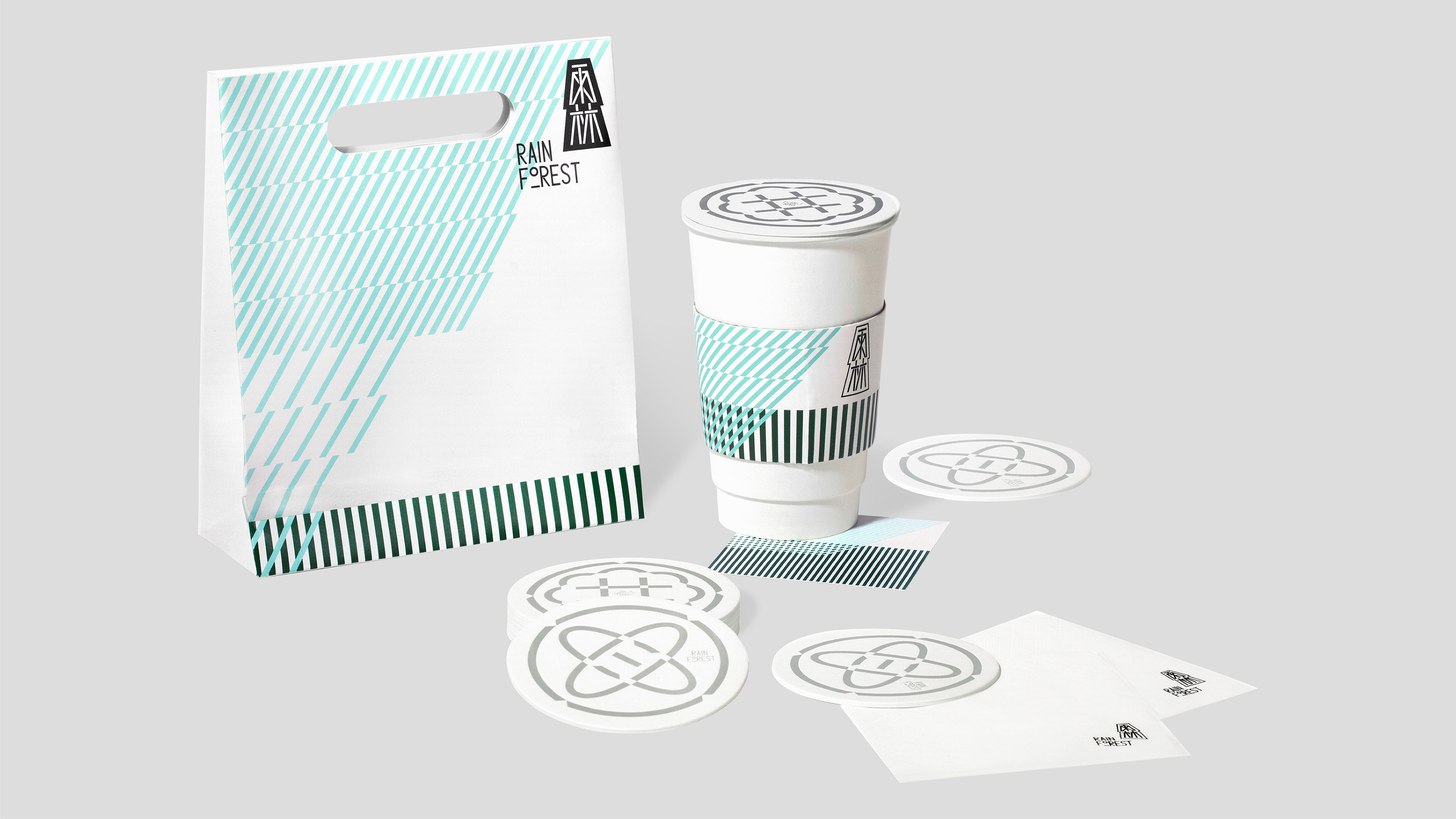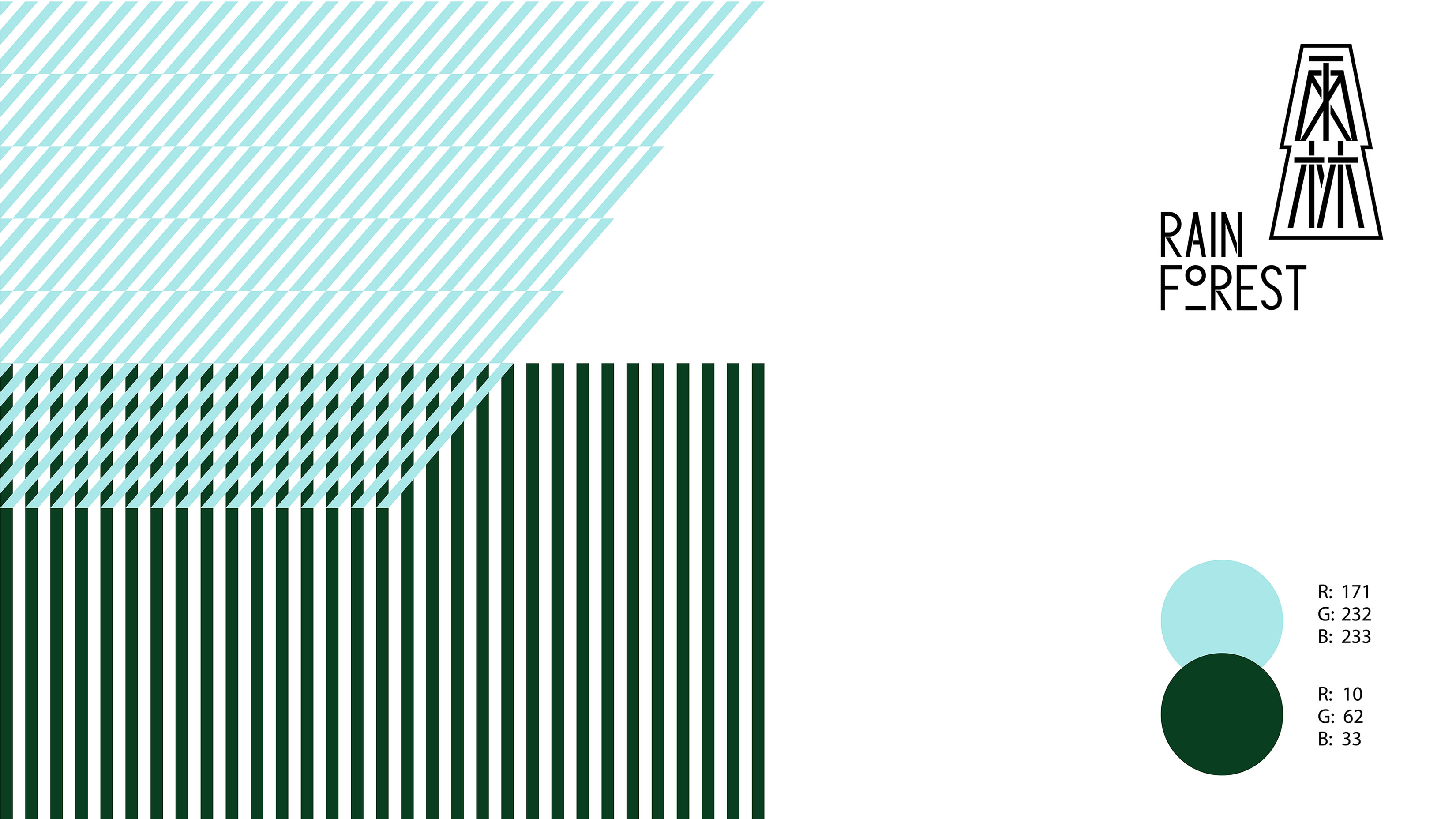 雨林是“树木”和“雨水”的集合,字体经过间架结构的调整与笔画之间的交叠呈现出树木般稳固并向上递进的视觉趋势,辅助图形则用垂直与斜切的等宽线条交织出一副茂密湿润的雨林图景。